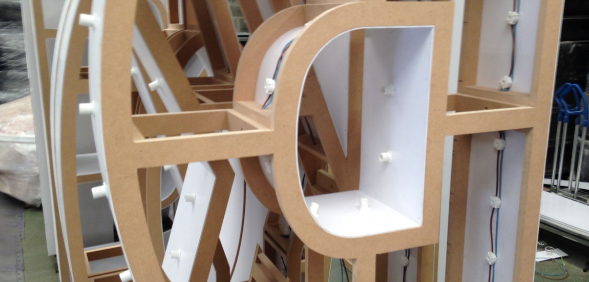 Production des vitrines: lettrage géant lumineux + accessoires dibond laqué + cheminées adhésivées