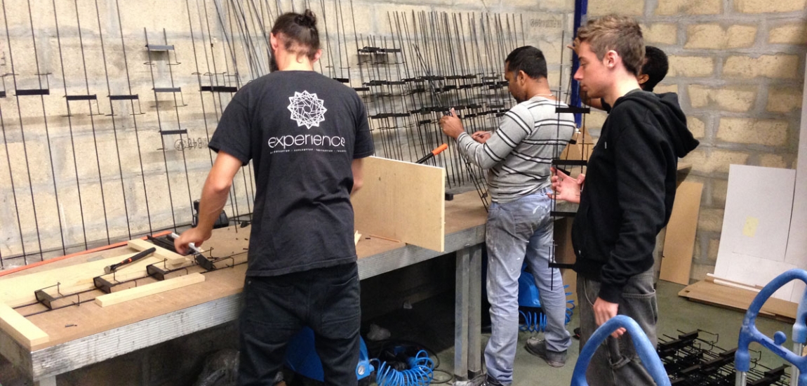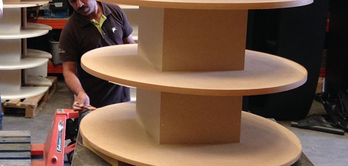 Production meubles « Tower » Grande Epicerie: découpe et soudure de métal + epoxy, caisson médium, dibond, PVC cintré, laque cabine mate.